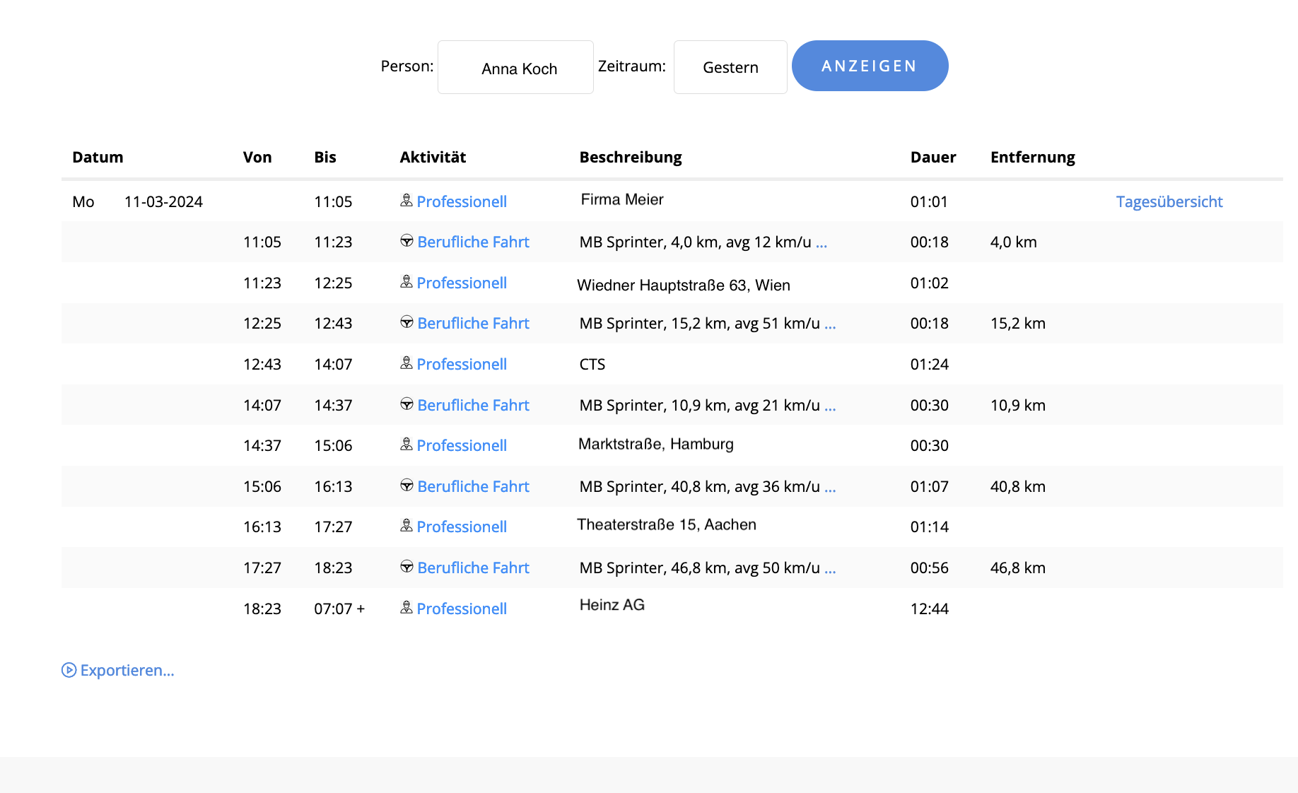 Der Aktivitätsbericht bietet einen Überblick über einen kompletten Tag für eine Person, einschließlich aller Fahrten, Stopps, Leerlaufzeiten, Standorte usw. Ein nützliches Instrument, um die Arbeit mobiler Mitarbeiter zu überwachen und die Daten bei Bedarf für den Arbeitszeitenbericht und die Mobilitätszulage zu verbessern.